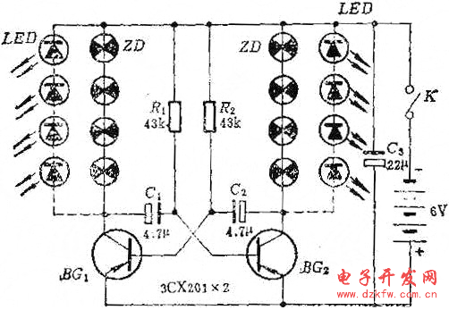 電路在工作時,是兩組微型燈泡(或LED)交替閃光