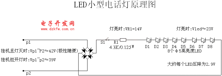 簡(jiǎn)單電話(huà)線(xiàn)供電的LED臺(tái)燈電路原理圖