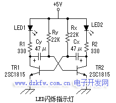 第一種電路很簡單,采用常見的三極管對稱多諧振蕩器,這種電路能通過調(diào)整RC的值改變頻率和占空比,用做指示燈振蕩器是比較合適的。按照圖示取值,本電路的振蕩頻率約為0.78Hz。