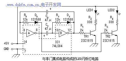 第二種電路采用了與非門集成電路74LS04,使用其中的兩個門構(gòu)成多諧振蕩器,通過三極管C1815進(jìn)行驅(qū)動發(fā)光二極管發(fā)亮。調(diào)整R3,R4可調(diào)整發(fā)光二極管的亮度。改變CX,CY,RX,RY的值可以改變振蕩頻率和占空比,按照圖示的參數(shù),振蕩頻率約為0.93Hz。