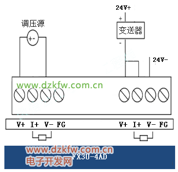 2三菱,FX3U-4AD 官網上的手冊是這樣的接線: