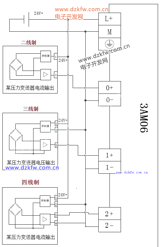 4、變送器與模擬量模塊之間的信號如何傳輸:通過四線制、三線制及兩線制的接線: