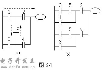 如圖5-1所示觸點1、2接通時,有一個假想的"概念電流"或"能流"(Power Flow)從左向右流動,這一方向與執行用戶程序時的邏輯運算的順序是一致的。能流只能從左向右流動。利用能流這一概念,可以幫助我們更好地理解和分析梯形圖。圖5-1a中可能有兩個方向的能流流過觸點5(經過觸點1、5、4或經過觸點3、5、2),這不符合能流只能從左向右流動的原則,因此應改為如圖5-1b所示的梯形圖。