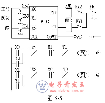 圖5-5 用PLC控制電動機正反轉(zhuǎn)的I/O接線圖和梯形圖