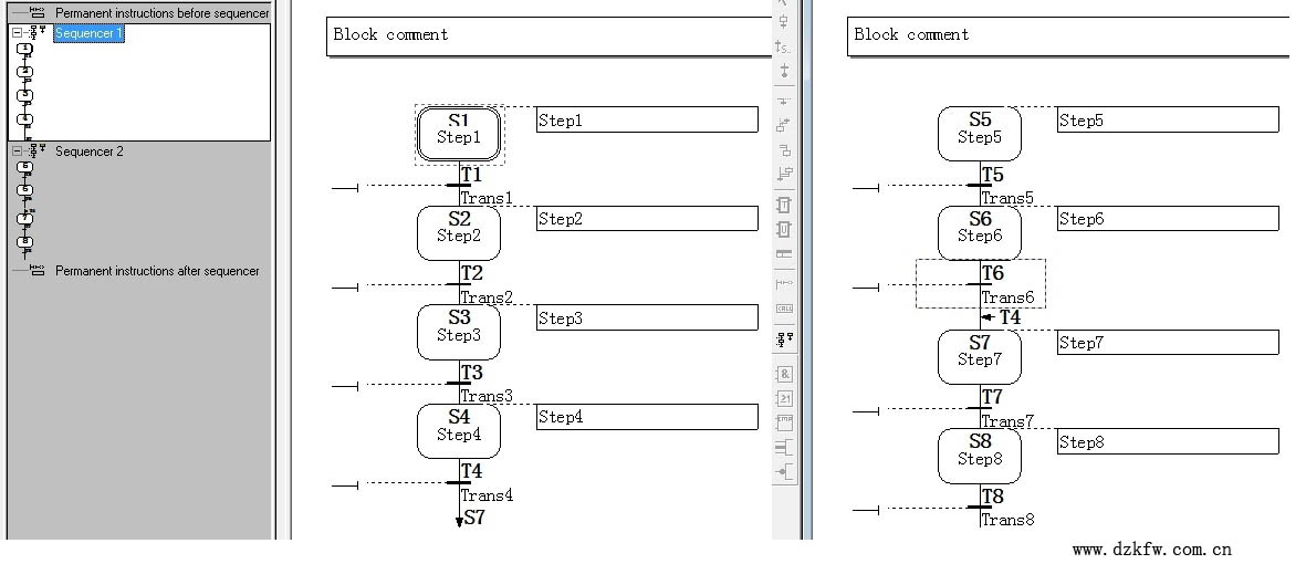在左邊的Overview窗口中生成兩個順控器(見下圖),從Sequencer 1的轉(zhuǎn)換T4可以跳轉(zhuǎn)到Sequencer 2的步7。