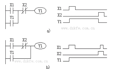 圖1a為停止優先程序,即當X1和X2同時接通,則Y1斷開。圖1b為起動優先程序,即當X1和X2同時接通,則Y1接通。起保停程序也可以用置位(SET)和復位(RST)指令來實現。在實際應用中,起動信號和停止信號可能由多個觸點組成的串、并聯電路提供。