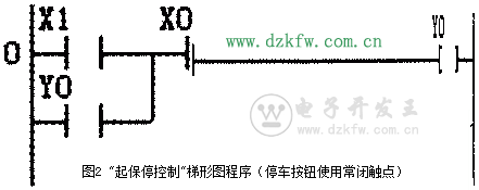 圖2 "起保?刂"梯形圖程序(停車按鈕使用常閉觸點(diǎn))