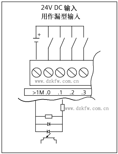 源型輸入:電流從PLC內部流出經外部開關至電源負極,1M端接電源正極。