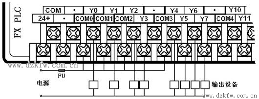 PLC與輸出設備連接時,不同組(不同公共端)的輸出點,其對應輸出設備(負載)的電壓類型、等級可以不同,但同組(相同公共端)的輸出點,其電壓類型和等級應該相同。要根據輸出設備電壓的類型和等級來決定是否分組連接。如圖1所示以FX2N為例說明PLC與輸出設備的連接方法。圖中接法是輸出設備具有相同電源的情況,所以各組的公共端連在一起,否則要分組連接。圖中只畫出Y0-Y7輸出點與輸出設備的連接,其它輸出點的連接方法相似。