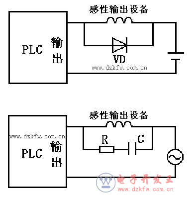 PLC的輸出端經常連接的是感性輸出設備(感性負載),為了抑制感性電路斷開時產生的電壓使PLC內部輸出元件造成損壞。因此當PLC與感性輸出設備連接時,如果是直流感性負載,應在其兩端并聯續流二極管;如果是交流感性負載,應在其兩端并聯阻容吸收電路。如圖2所示。