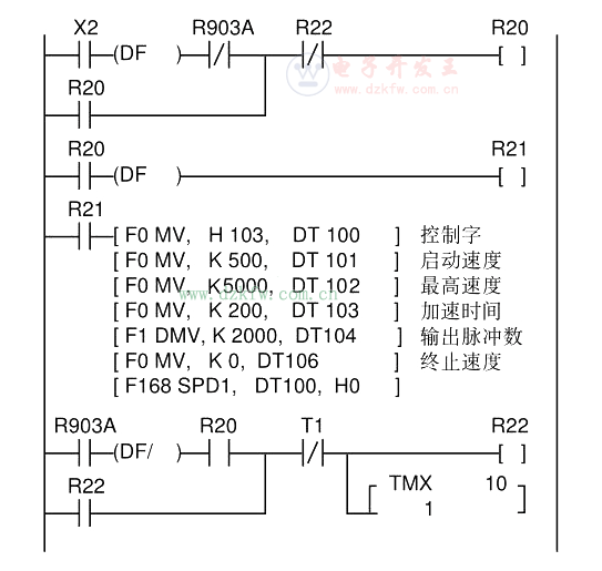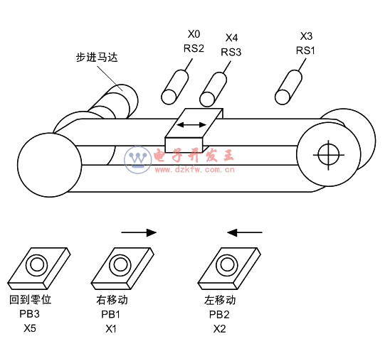 上圖中的運輸設備中,當按下PB1(X1),便會向右移動一段距離然后停下。按下PB2(X2)時,則自動退回原來的位置。在系統(tǒng)運行之前,需要按下PB3(X5),設備進行回零位操作后,才能啟動系統(tǒng)。