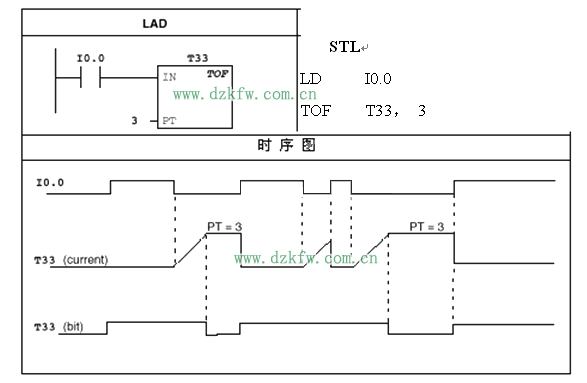 對S7-200 PLC, 只要I0.0=“1”,即計時,當T33當前值=3時,定時器繼續計時,直至I0.0=“0”,定時器復位(相當于10002=“0” )
