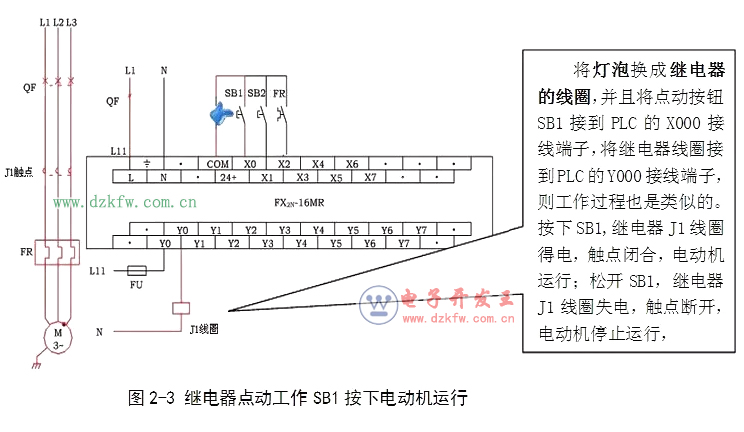 開機 = 按下常開按鈕0 → 繼電器線圈J0得電 → J0常開主觸點閉合 → 電機得電開機、同時J0常開輔助觸點自鎖 → 電機繼續運行,如圖2-8。