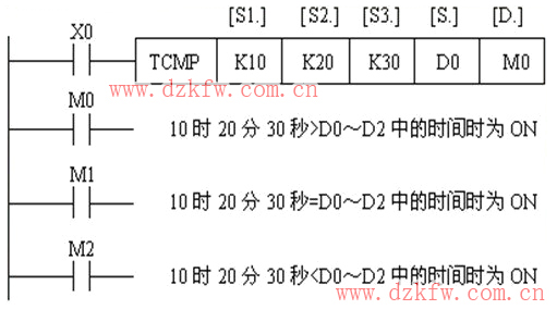 (1)時鐘數據比較指令TCMP(FNC160) TCMP(P)它的功能是用來比較指定時刻與時鐘數據的大小。如圖3- 86所示,將源操縱數[S1.]、[S2.]、[S3.]中的時間與[S.]起始的3點時間數據比較,根據它們的比較結果決定目標操縱數[D.]中起始的3點單元中取ON或OFF的狀態。該指令只有16位運算,占11個程序步。它的源操縱數可取T、C和D,目標操縱數可以是Y、M和S。