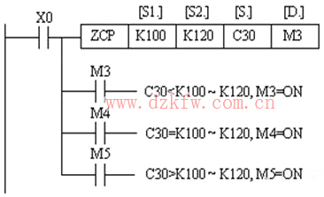 ZCP指令是將一個操作數(shù)[S.]與兩個操作數(shù)[S1.]和[S2.]形成的區(qū)間比較,且[S1.]不得大于[S2.],結(jié)果送到[D.]中。ZCP指令使用說明如圖所示。