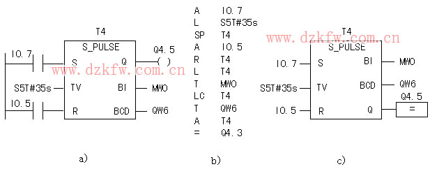 圖示脈沖擴(kuò)展定時(shí)器(SE)。當(dāng)S端由0變?yōu)?而產(chǎn)生上升沿時(shí),T4開始計(jì)時(shí),Q4.5保持為1計(jì)時(shí),到達(dá)后,Q4.5變?yōu)?。