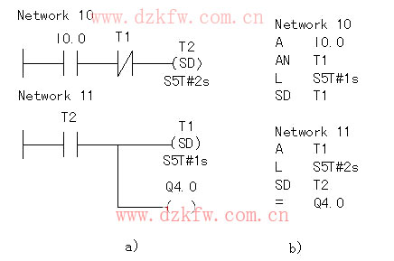 ②采用延時(shí)通定時(shí)器簡(jiǎn)化指令,其梯形圖和語句指令程序見圖。