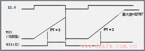 當使能輸入接通時,接通延時定時器和有記憶接通延時定時器開始計時,當定時器的當前值(Txxx)大于等于預設值時,該定時器位被置位。當使能輸入斷開時,清除接通延時定時器的當前值,而對于有記憶接通延時定時器,其當前值保持不變。可以用有記憶接通延時定時器累計輸入信號的接通時間,利用復位指令(R)清除其當前值。
