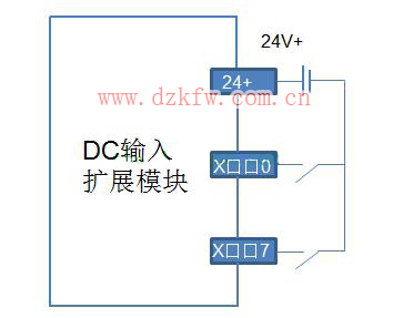 由于擴展模塊內部沒有電源電路,它只能由外部為輸人電路提供DC24V電壓,在輸入接線時將DC24V正極接擴展模塊的24+端子,DC24V負極接開關,開關另一端接輸人端子。
