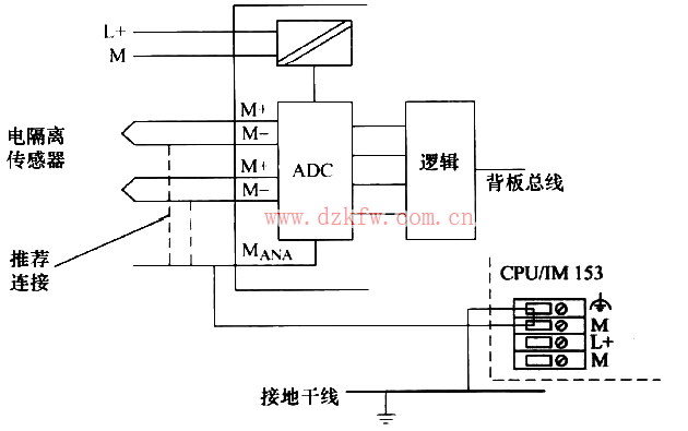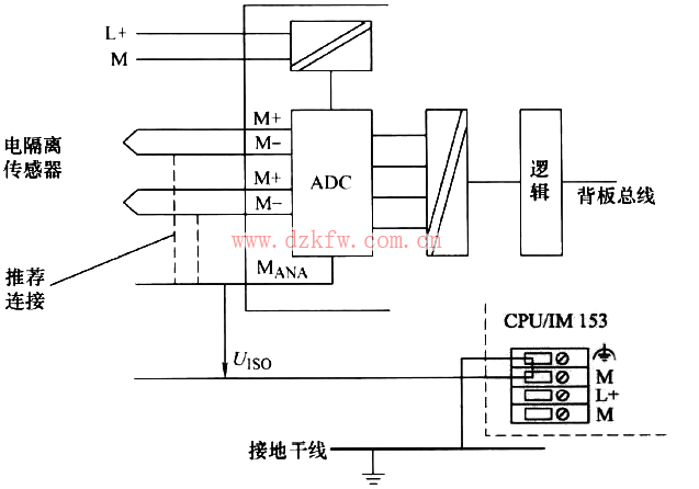 情況Ⅱ:將電氣隔離傳感器連接到非電氣隔離模擬量模板。可以在接地模式或未接地模式下操作CPU/IM 153,如圖14所示。