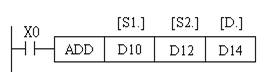(1)加法指令ADD (D)ADD(P)指令的編號為FNC20。它是將指定的源元件中的二進制數相加結果送到指定的目標元件中去。如圖1所示,當X0為ON時,執行(D10)+(D12)→(D14)。