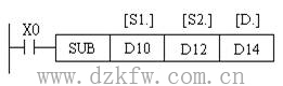 (2)減法指令SUB (D)SUB(P)指令的編號為FNC21。它是將[S1.]指定元件中的內容以二進制形式減去[S2.]指定元件的內容,其結果存入由[D.]指定的元件中。如圖2所示,當X0為ON時,執行(D10)—(D12)→(D14)。