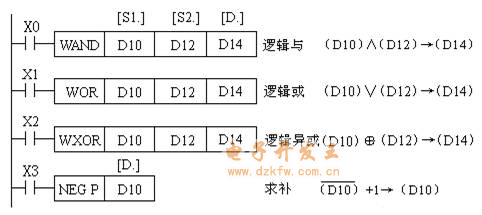 3)WAND、WOR、WXOR指令16位運算占7個程序步,32位為13個程序步,而NEG分別占3步和5步。