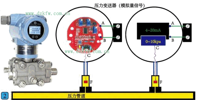 看圖2,在圖2中最左邊的器件叫壓力變送器,如果我們想要在遠方知道就地的壓力數值就全靠它了。它是怎么做到的呢?看圖2的中間,其實壓力變送器它里面就是一塊電路板,電路板連接著一個壓力傳感器F。它的工作原理就是壓力傳感器F實時檢測管道壓力,把檢測到的壓力再傳到電路板的C,檢測信號進入電路板后,通過電路板的轉換與計算,把這個壓力信號轉換成一個電流信號由A和B這兩個點輸出。圖2最右邊就是這個轉換的示意圖,我們看到它可以把一個0-10kpa的壓力信號轉換成一個4-20mA的電流信號,由A和B這兩個點輸出。這時我們就說A和B這兩個點輸出的就是一個模擬量信號。這個模擬量電信號可以是4-20mA的電流信號,也可以是0-10V的電壓信號。模擬量信號的特點是它的值是在一個數值范圍內連續可變的。這就是所說的模擬量信號。下面看一下模擬量信號是怎么把壓力信號遠傳輸出的。