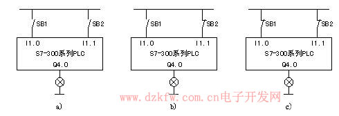 例: S7-300輸入端口上接入的控制按鈕類型各不相同,圖a)的I1.0與I1.1端口均接入常開按鈕SB1、SB2,圖b)的I1.0端口接入常開按鈕SB1、I1.1端口接入常閉按鈕SB2,圖7-21c)的I1.0與I1.1 端口均接入常閉按鈕SB1、SB2。
