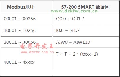 Modbus地址與Modbus的功能碼是兩個概念。根據 Modbus 通信協議,Modbus 數據的地址使用 0*x、1*x、3*x 和 4*x 的形式,分別表示數字量輸出、數字量輸入、模擬量輸入等數據地址。在使用 S7-200 的指令庫時,Modbus 數據地址與 S7-200 的 I/O 和數據存儲區地址間有特定的對應關系。