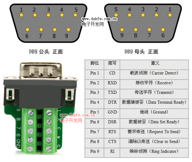 DB9的公頭的引腳號(hào)是從左往右定義,母頭是從右往左定義,這樣公頭母頭對(duì)接時(shí),相同的引腳號(hào)才對(duì)應(yīng)。