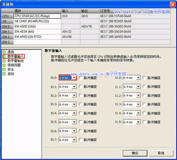STEP7軟件 單擊 “系統塊” (System Block) 對話框的 “數字量輸入” (Digital Inputs) 節點組態數字量輸入濾波器和脈沖捕捉位。