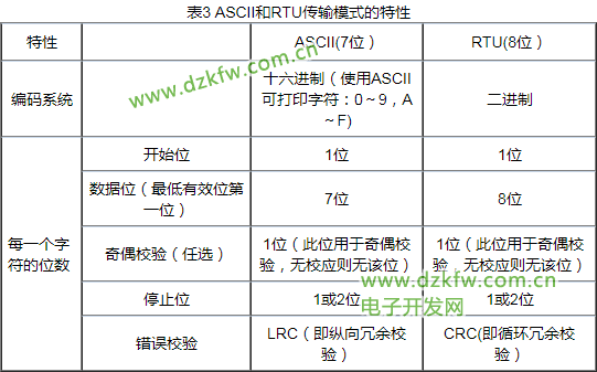 表3 ASCII和RTU傳輸模式的特性