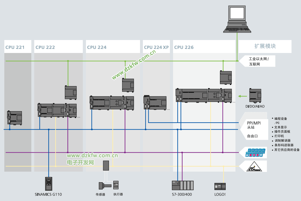 如下圖,S7-200PLC可以連接很多外部設備,可以連接GPRS,變頻器,觸摸屏等等,通過擴展模塊都可以連接互聯網,可見麻雀雖小五臟俱全。