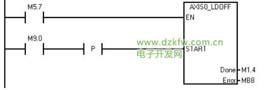 開啟START參數將向運動軸發出LDOFF命令。對于在 START參數開啟且運動軸當前不繁忙時執行的每次掃描,該子例程向運動軸發送一個LDOFF命令。為了確保僅發送了一個命令,請使用邊沿檢測元素用脈沖方式開啟START參數。
