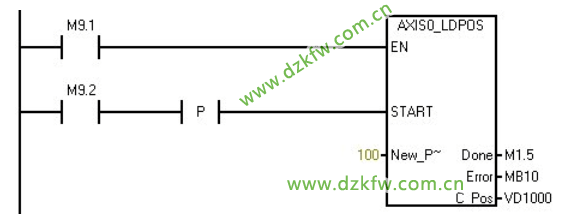 START參數開啟將向運動軸發出LDPOS命令。對于在 START參數開啟且運動軸當前不繁忙時執行的每次掃描,該子例程向運動軸發送一個LDPOS命令。為了確保僅發送了一個命令,請使用邊沿檢測元素用脈沖方式開啟START參數;