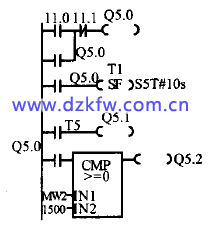 控制程序實現下述功能:按下開機按鈕I1.0,發動機Q5.0和冷卻風扇Q5.1開始運行;同時存放在MW2中的發動機的轉速與程序中預置的轉速(本例中為1500r/min)進行比較,超速時發出報警信號Q5.2;按下停機按鈕I1.1,發動機停止運行,冷卻風扇被定時器Tl延遲10s后停止運行。