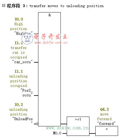 上圖中,“常開點”I0.3、I1.2、I1.1及“常閉點”I0.2串聯后,與“常開點”M0.0并聯,然后為“線圈”Q4.2供電。在“繼電器與接觸器“型電路中,用梯形圖編程會顯得一目了然,猶如看電氣連接圖一般。