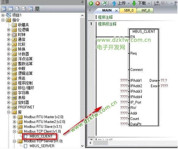2、鼠標(biāo)點(diǎn)擊 MAIN 主程序的程序段1的編程區(qū)域,從庫(kù)文件夾下找到 Modbus TCP 客戶端指令 MBUS_CLIENT,鼠標(biāo)雙擊,指令出現(xiàn)在程序段1中,操作如圖3.所示。