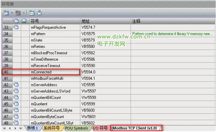 S7-200 SMART CPU作為Modbus TCP客戶端時(shí):通過(guò)Modbus TCP Client指令 MBUS_CLIENT 的符號(hào)表中的 mConnected 參數(shù)來(lái)判斷,如圖1.所示