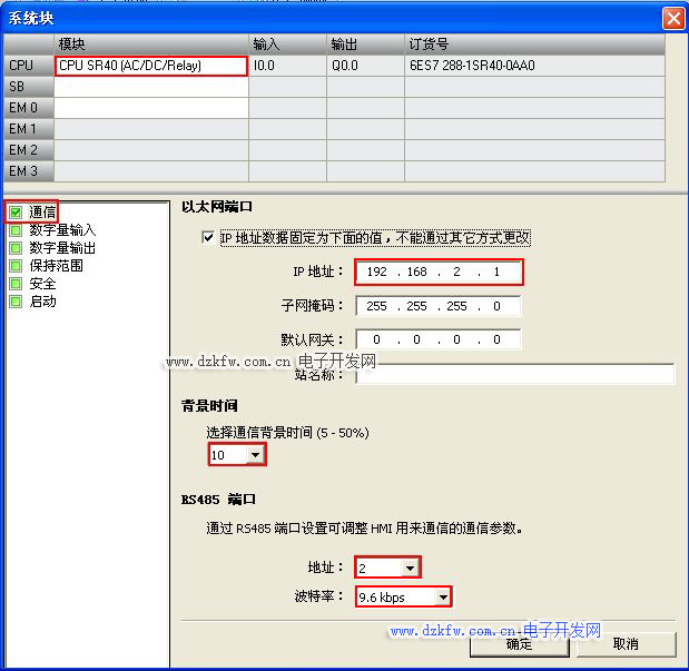 單擊“系統塊”(System Block)對話框的“通信”(Communication)節點組態以太網端口、背景時間和RS485端口。