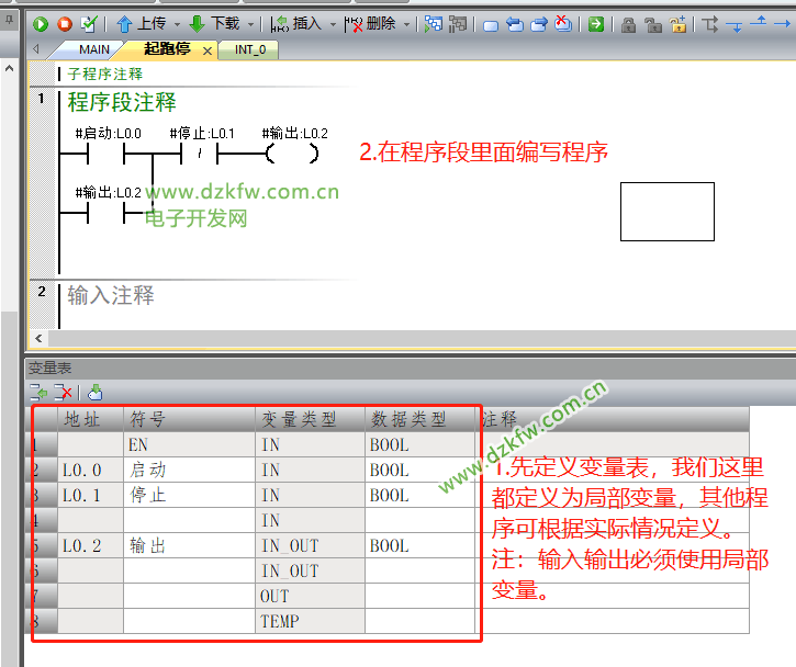 一.編寫子程序在軟件子程序下編寫起跑停程序,輸入輸出用子程序局部變量(如果建立其他庫指令,只需要將輸入輸出改成子程序里面的局部變量L就行,其他中間變量可以用M區或者V區的)具體操作如下:1. 先將子程序名稱更改為“起跑停”,如圖2. 編寫程序,定義變量表,具體如下:
