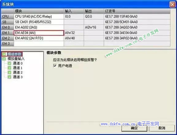 單擊"系統塊"(System Block) 對話框的"模擬量輸入"(Analog Inputs) 節點為在頂部選擇的模擬量輸入模塊組態選項。