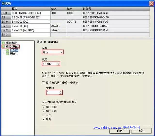 當 CPU 處于 STOP 模式時,可將模擬量輸出點設置為特定值,或者保持在切換到 STOP模式之前存在的輸出狀態。STOP 模式下,有兩種方法可用于設置模擬量輸出行為:● "將輸出凍結在最后狀態"(Freeze outputs in last state):單擊此復選框,就可在 PLC 進行 RUN 到 STOP 轉換時將所有模擬量輸出凍結在其最后值。● "替換值"(Substitute value) :如果"將輸出凍結在最后狀態"(Freeze outputs in last state) 復選框未選中,只要 CPU 處于 STOP 模式就可輸入應用于輸出的值(-32512 到 32511 )。默認替換值為 0 。