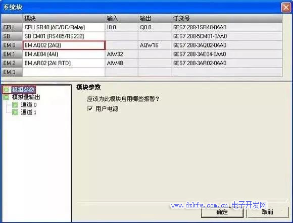 單擊"系統塊"(System Block)對話框的"模擬量輸出"(Analog Outputs) 節點為在頂部選擇的模擬量輸出模塊組態選項。