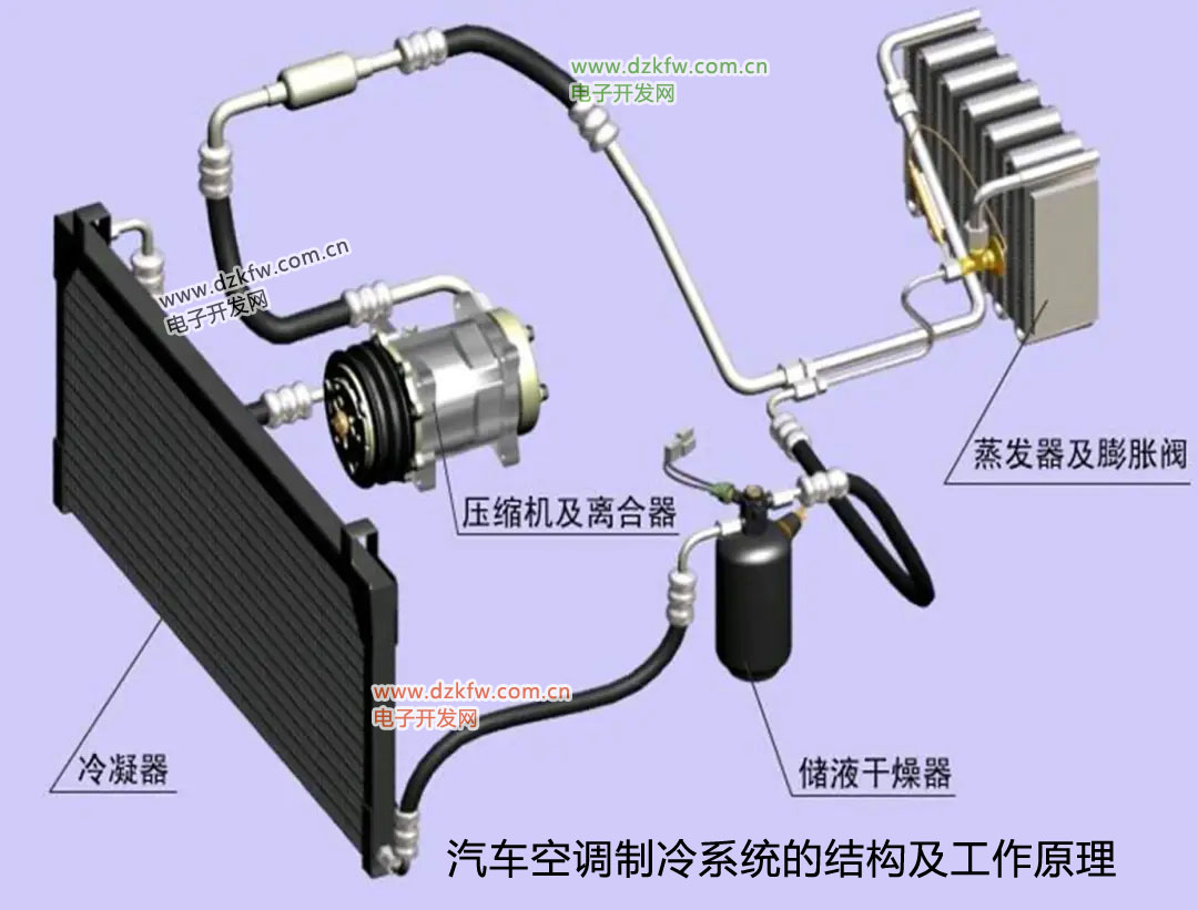 汽車空調(diào)制冷系統(tǒng)由壓縮機(jī)、冷凝器、儲(chǔ)液干燥器、膨脹閥、蒸發(fā)器、風(fēng)機(jī)及制冷管道等組成。