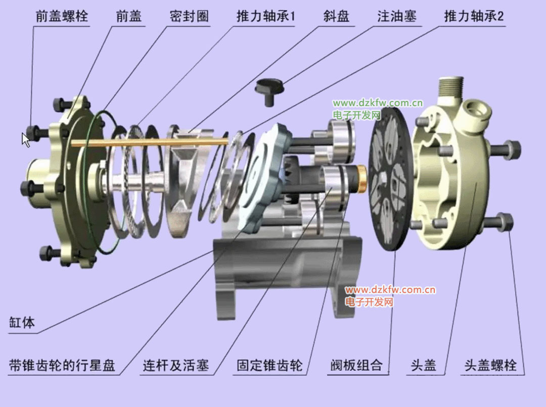 三缸斜板式,為三活塞等間隔120°分布,五缸斜板式為五活塞等間隔72°分布。為了使機(jī)器受力合理,結(jié)構(gòu)緊湊,通常將活塞制成雙頭活塞,如是軸向6缸,3缸在壓縮機(jī)前部,另外3缸在壓縮機(jī)后部;如是軸向10缸,5缸在壓縮機(jī)前部,另外5缸在壓縮機(jī)后部。雙頭活塞的兩活塞各自在相對(duì)的氣缸(一前一后)中,活塞一頭在前缸中壓縮制冷劑蒸氣時(shí),活塞的另一頭就在后缸中吸入制冷劑蒸氣,反向時(shí)互相對(duì)調(diào)。各缸均備有高低壓氣閥,另有一根高壓管,用于連接前后高壓腔。斜板與壓縮機(jī)主軸固定在一起,斜板的邊緣裝合在活塞中部的槽中,活塞槽與斜板邊緣通過(guò)鋼球軸承支承在一起。當(dāng)主軸旋轉(zhuǎn)時(shí),斜板也隨著旋轉(zhuǎn),斜板邊緣推動(dòng)活塞作軸向往復(fù)運(yùn)動(dòng)。如果斜板轉(zhuǎn)動(dòng)一周,前后兩個(gè)活塞各完成壓縮、排氣、膨脹、吸氣一個(gè)循環(huán),相當(dāng)于兩個(gè)氣缸作用。如果是軸向6缸壓縮機(jī),缸體截面上均勻分布3個(gè)氣缸和3個(gè)雙頭活塞,當(dāng)主軸旋轉(zhuǎn)一周,相當(dāng)于6個(gè)氣缸的作用。