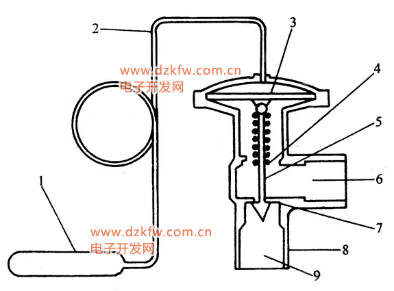 內(nèi)平衡熱力膨脹閥對(duì)來(lái)自儲(chǔ)液干燥器的高壓液態(tài)制冷劑節(jié)流降壓,即將液態(tài)高壓制冷劑從其孔口6中噴出,急劇膨脹,變成低壓霧狀體,以便吸熱氣化。此外,它還調(diào)節(jié)和控制進(jìn)入蒸發(fā)器中的液態(tài)制冷劑量,使之適應(yīng)制冷負(fù)荷的變化,同時(shí)防止壓縮機(jī)發(fā)生液擊現(xiàn)象和蒸發(fā)器出口蒸氣異常過(guò)熱。利用裝在蒸發(fā)器出口處的感溫包來(lái)感知制冷劑蒸氣的過(guò)熱度,由此來(lái)調(diào)節(jié)膨脹閥開(kāi)度的大小,從而控制進(jìn)入蒸發(fā)器的液態(tài)制冷劑流量。感溫包和蒸發(fā)器出口管接觸,蒸發(fā)器出口溫度降低時(shí),感溫包1、毛細(xì)管2和薄膜3腔內(nèi)的液體體積收縮,壓力降低,閥口將閉合,限制制冷劑進(jìn)入蒸發(fā)器。相反孔口開(kāi)啟,制冷劑流入蒸發(fā)器。隨著針閥開(kāi)啟,較多的制冷劑進(jìn)入蒸發(fā)器,蒸發(fā)器內(nèi)壓力上升,回氣溫度降低,膜片下側(cè)壓力增加,閥門(mén)關(guān)閉。由于膜片上、下側(cè)壓力處于不平衡狀態(tài),因此孔口不斷地開(kāi)啟和閉合,使制冷裝置與負(fù)載相匹配。感溫包和蒸發(fā)器必須緊密接觸,不能和大氣相通。如果接觸不良,感溫包就不能正確地感應(yīng)蒸發(fā)器出口的溫度。如果密封不嚴(yán),感應(yīng)的溫度是大氣溫度。所以,要用一種特殊的空調(diào)膠帶,捆扎和密封感溫包。外平衡熱力膨脹閥外平衡和內(nèi)平衡熱力膨脹閥的結(jié)構(gòu)是大同小異的,內(nèi)平衡式膜片下方的壓力是蒸發(fā)器進(jìn)口壓力,而外平衡式膜片下方的壓力是蒸發(fā)器出口的壓力。由于蒸發(fā)器內(nèi)部會(huì)產(chǎn)生壓力損失,蒸發(fā)器出口壓力要小于進(jìn)口壓力。要達(dá)到同樣的閥開(kāi)度,外平衡式需要的過(guò)熱度小些,蒸發(fā)器容積效率可以提高。大客車空調(diào)系統(tǒng)要選用外平衡熱力膨脹閥。H型膨脹閥