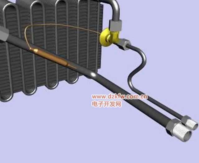 H型膨脹閥因其內(nèi)部通道形同H形而得名。它取消了外平衡膨脹閥的外平衡管和感溫包,直接與蒸發(fā)器進(jìn)出口相連。它有四個(gè)接口通往空調(diào)系統(tǒng),其中兩個(gè)接口和普通膨脹閥一樣,一個(gè)接干燥過(guò)濾器出口,一個(gè)接蒸發(fā)器入口。另外兩個(gè)接口,一個(gè)接蒸發(fā)器出口,一個(gè)接壓縮機(jī)進(jìn)口。感溫元件處在進(jìn)入壓縮機(jī)的制冷劑氣流中。H型膨脹閥具有結(jié)構(gòu)緊湊、使用可靠、維修簡(jiǎn)單等優(yōu)點(diǎn),符合汽車空調(diào)的要求。 這種膨脹閥安裝在蒸發(fā)器的進(jìn)出管之間,感應(yīng)溫度不受環(huán)境影響,也無(wú)需通過(guò)毛細(xì)管而造成時(shí)間滯后,調(diào)節(jié)靈敏度較高。由于無(wú)感溫包、毛細(xì)管和外平衡管,不會(huì)因汽車顛簸使充注系統(tǒng)斷裂外漏以及感溫包包扎松動(dòng)而影響膨脹閥的正常工作。膨脹節(jié)流管(孔管)膨脹節(jié)流管是用于許多轎車制冷系統(tǒng)的一種固定孔口的節(jié)流裝置。有人稱它為孔管、固定孔管。膨脹節(jié)流管直接安裝在冷凝器出口和蒸發(fā)器進(jìn)口之間,用于將液態(tài)制冷劑節(jié)流降壓。由于不能調(diào)節(jié)流量,液體制冷劑很可能流出蒸發(fā)器而進(jìn)入壓縮機(jī),造成壓縮機(jī)液擊。所以裝有膨脹節(jié)流管的系統(tǒng),必須同時(shí)在蒸發(fā)器出口和壓縮機(jī)進(jìn)口之間,安裝一個(gè)集液器,實(shí)行氣液分離,避免壓縮機(jī)發(fā)生液擊。 膨脹節(jié)流管系統(tǒng)目前使用的溫度控制方法有:循環(huán)離合器膨脹節(jié)流管系統(tǒng)(CCOT)、可變?nèi)莘e膨脹節(jié)流管系統(tǒng)(VDOT)、固定膨脹節(jié)流管離合器系統(tǒng)等。