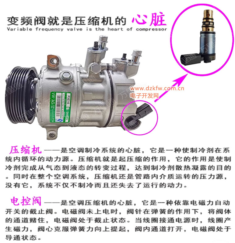 制冷壓縮機(jī)是汽車空調(diào)制冷系統(tǒng)的心臟,其作用:是維持制冷劑在制冷系統(tǒng)中的循環(huán),吸入來(lái)自蒸發(fā)器的低溫、低壓制冷劑蒸氣,壓縮制冷劑蒸氣使其壓力和溫度升高,并將制冷劑蒸氣送往冷凝器。其原理與普通空氣壓縮機(jī)相似,只是密封程度要求更高。